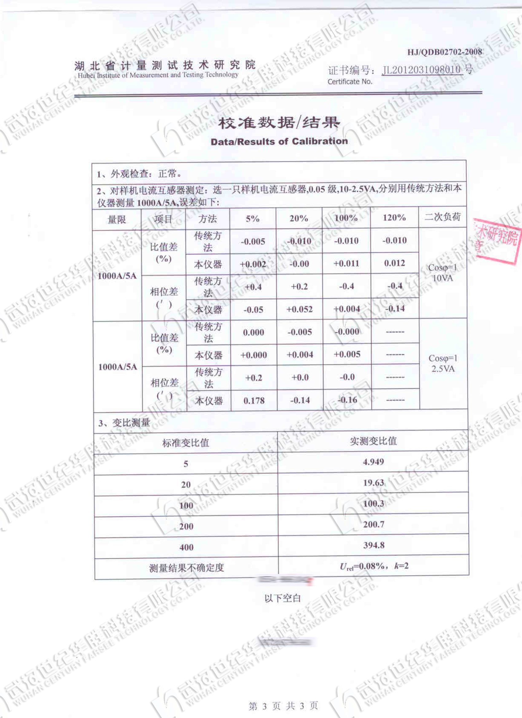 注:二次電流為1A的電流互感器,通過(guò)等安匝測(cè)量方法變比可至31500A/1A。