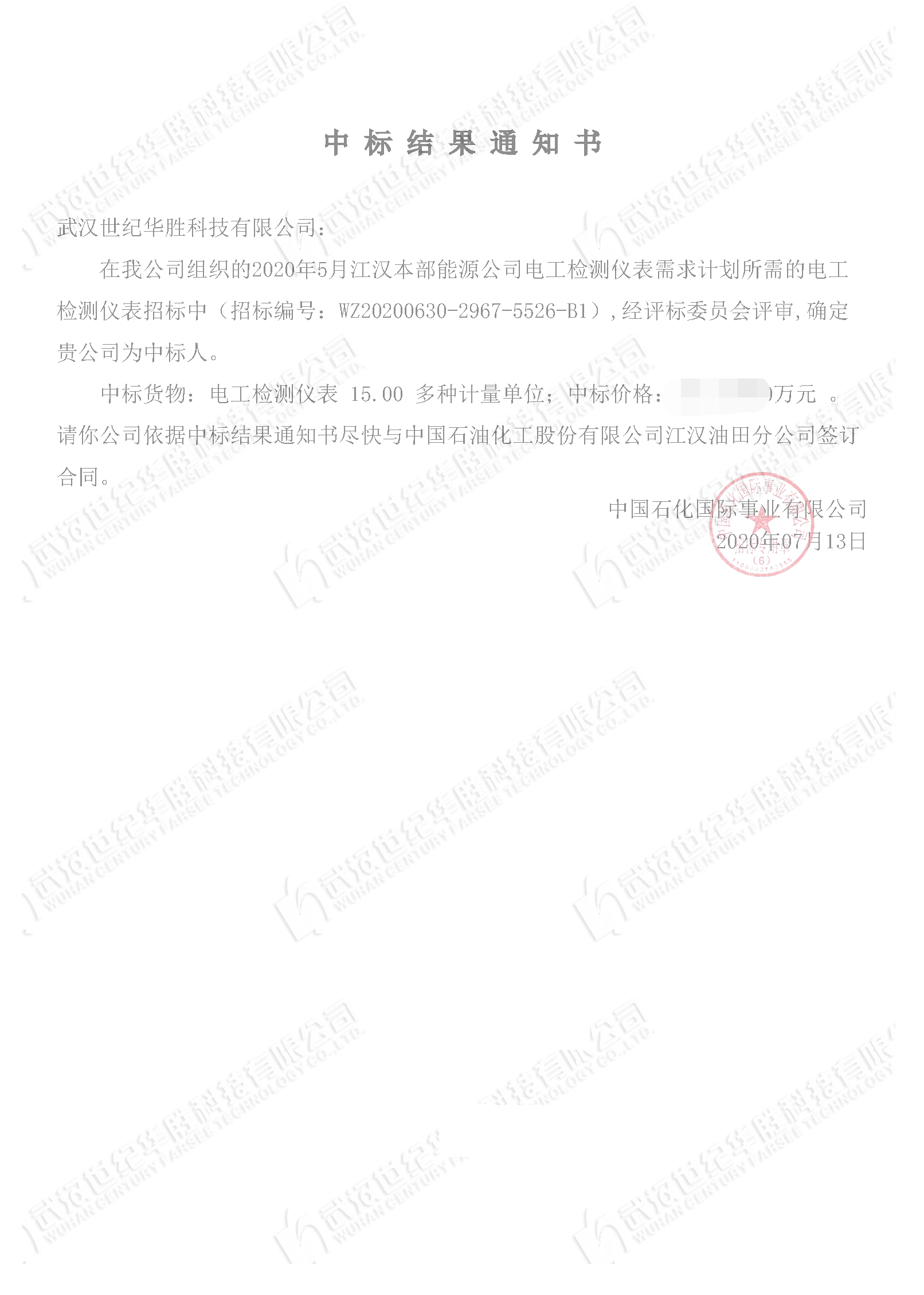 7月中旬,我司在中國石化江漢本部能源公司電工檢測儀表項目中成功中標。