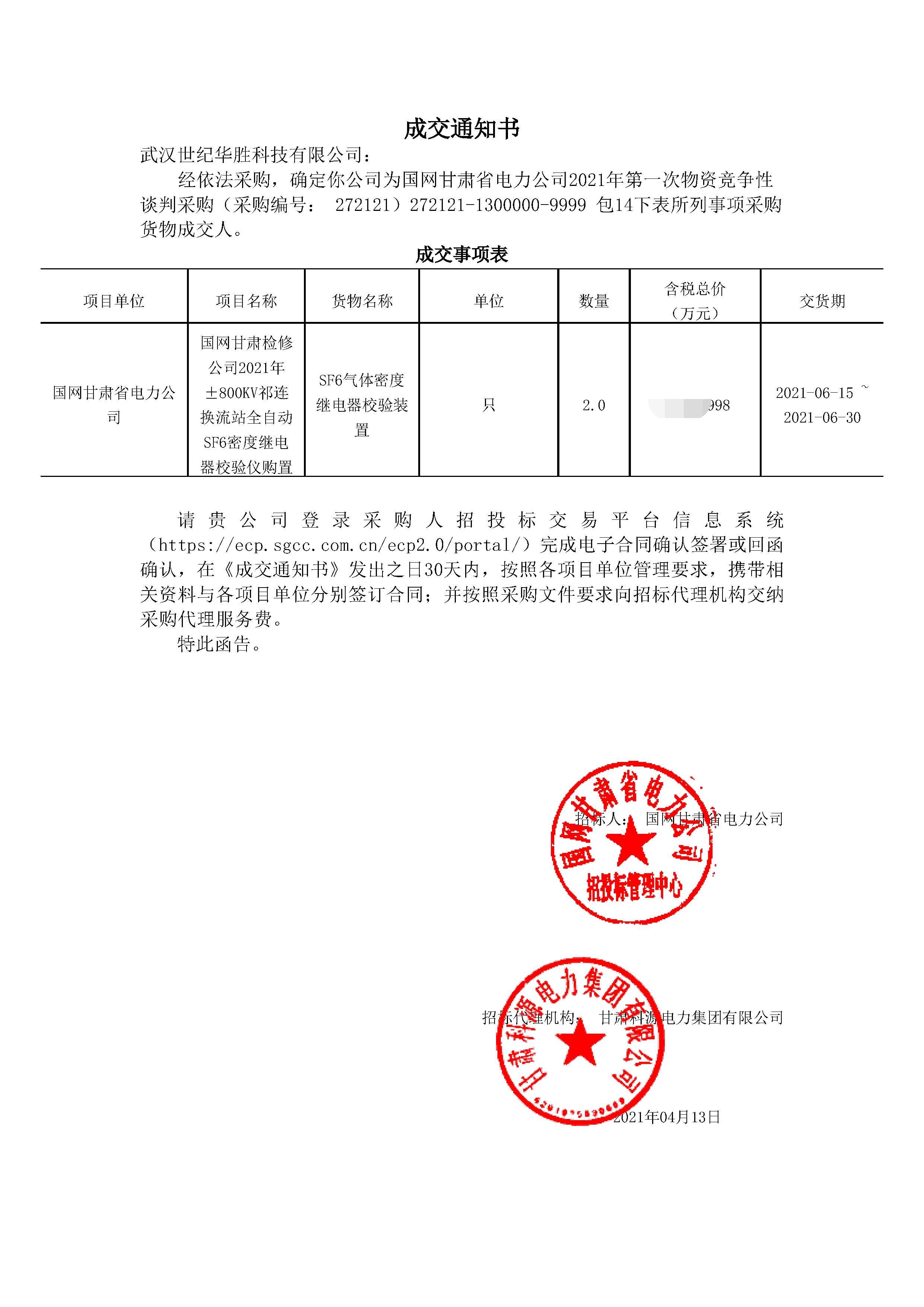 熱烈祝賀武漢世紀華勝科技有限公司在國網(wǎng)甘肅省電力公司2021年第一-次物資競爭性 談判采購項目中中標